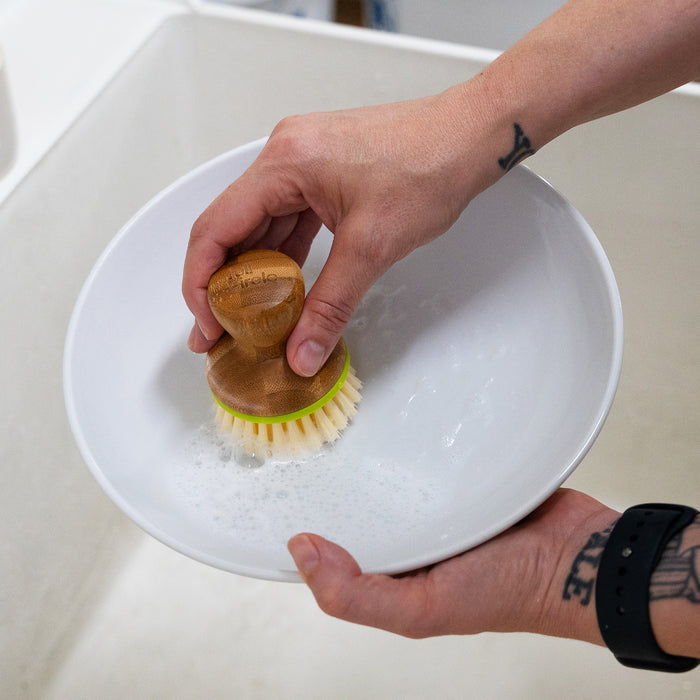 Get a sponge, dish brush, or clean cloth wet and rub it over the top of the dish soap. Be sure to work up a good lather before applying to dishes so soap can wash away fully.