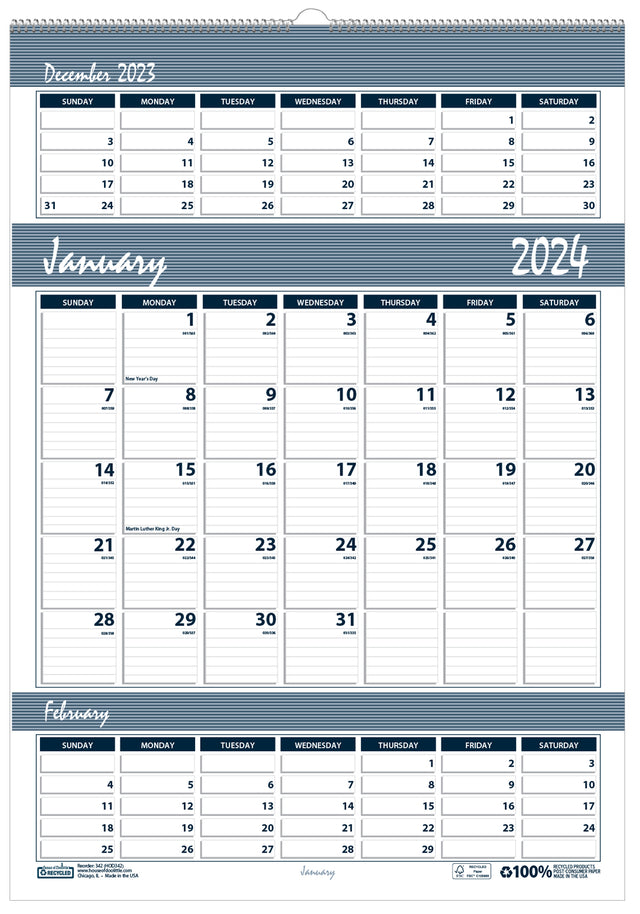 - Three month view on each page featuring 2-7/8" x 1-3/4" ruled blocks allocated for each day